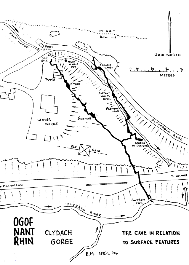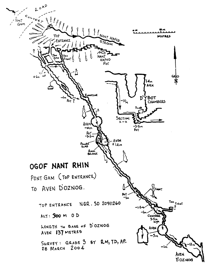 The survey of the cave down from the relatively new top entrance to the Aven d'Oznog pitch has been completed and drawn up by Roy Morgan. Looking at the survey, it looks very tight. Nant Hafod pot may be associated with the Kerplunk area of Nant Rhin. It should be noted that the bottom entrance of Nant Rhin is in a pretty poor state after a runaway lorry on the Heads of the Valley road crashed down on top of it!