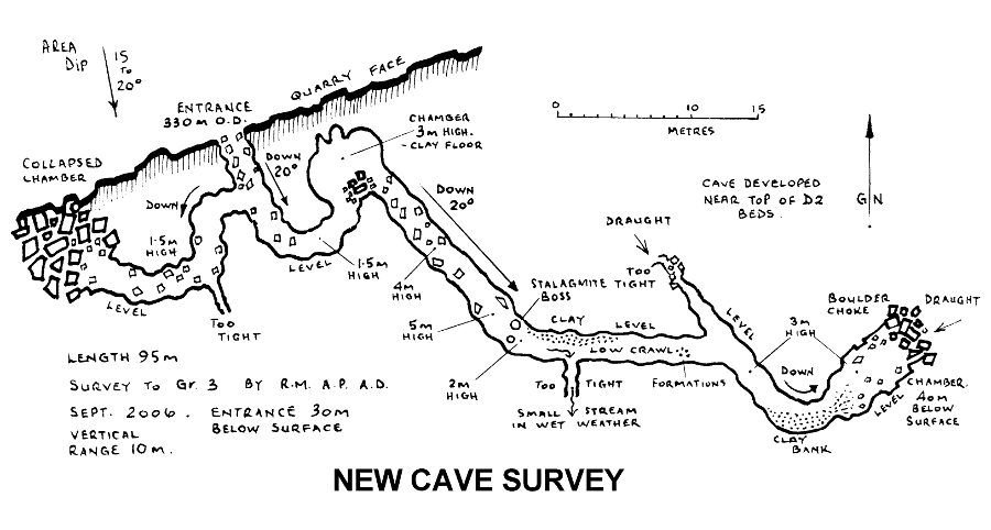A new cave has been exposed by quarrying activities. At present, it is about 90 metres long, ending in a boulder choke but likely to get substantially smal er when they start quarrying into it. Obviously there is no official access to this site access to this site.