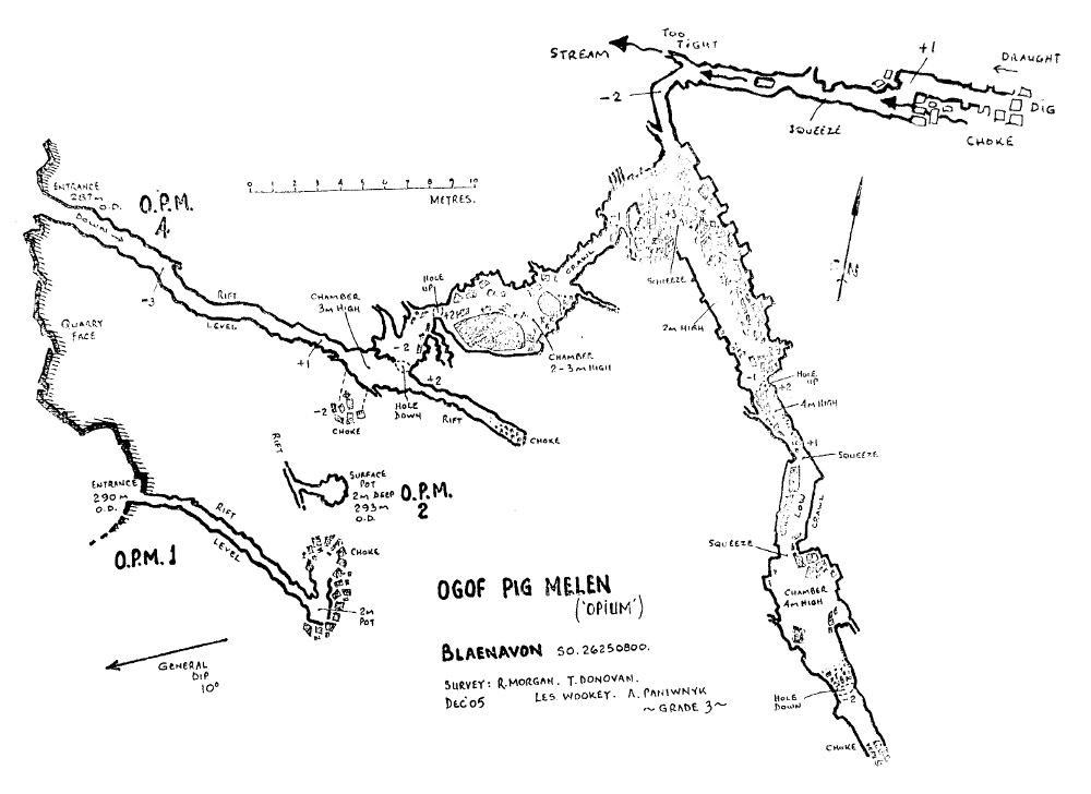 The Ogof Pig Melin (OPM) caves are situated in a small quarry to the south of Blaenavon adjacent to the A4043. Rifts in