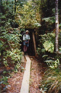 We had moved on to the Coromandel Peninsula in the north-east by now to do some walking. We started early at Broken Hills in the Coromandel Forest Park. Our plan was to climb Hihi (718 metres) via the Water Race Tunnels and Collins Drive, an abandoned gold mine, and then descend into the Kauaeranga Valley to camp. But first the relies wanted show us the Gem of the Boom Creek Walk. This short walk took in another small mine complete with wetters. Wetters are stick-insect like creatures that live in caves and mines. The roof was crawling with them, and some of them were over four inches long!