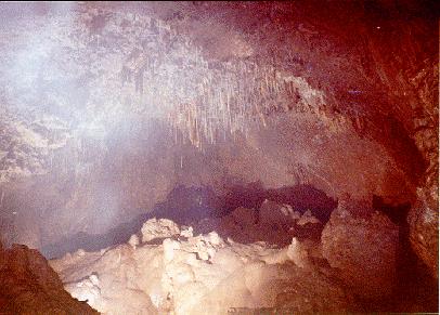 We quickly stowed cameras and excess gear on a handy mud bank and decided to explore as far as we could before photography or surveying. I set off through the large gap at the end of the passage to emerge in a larger chamber, about three times the size of the one we'd just left. This one was about 9m by 40m long with an 8ft calcite cascade in the middle. Every wall of the passage was covered in straws, stals and flow stone making this section at least on par with the better parts of Hagg Gill. From the ceiling of the upper level a large 3mÆ calcite boss hangs down festooned with straws and stalactites and below an also suitably impressive boss with stalagmites.