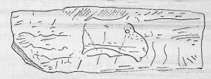 ".. of a small fragment of rib... with the incised figure of a horse; ..It is the first instance of the discovery of the figure of an animal in this country,..?" [Dawkins,1880,pp184-5]
