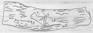 Another notable inscribed bone was found in Pin _Hole in 1929. This is frequently described ~s a 'Masked Human Figure' (Fig.4). -This, according to Campbell' [1977,v1p174], "is the only example in British Upper Palaeolithic 'art' of a human figure known thus far". He suggests that this may belong to the "Mesolithic/Later Upper Palaeolithic".
