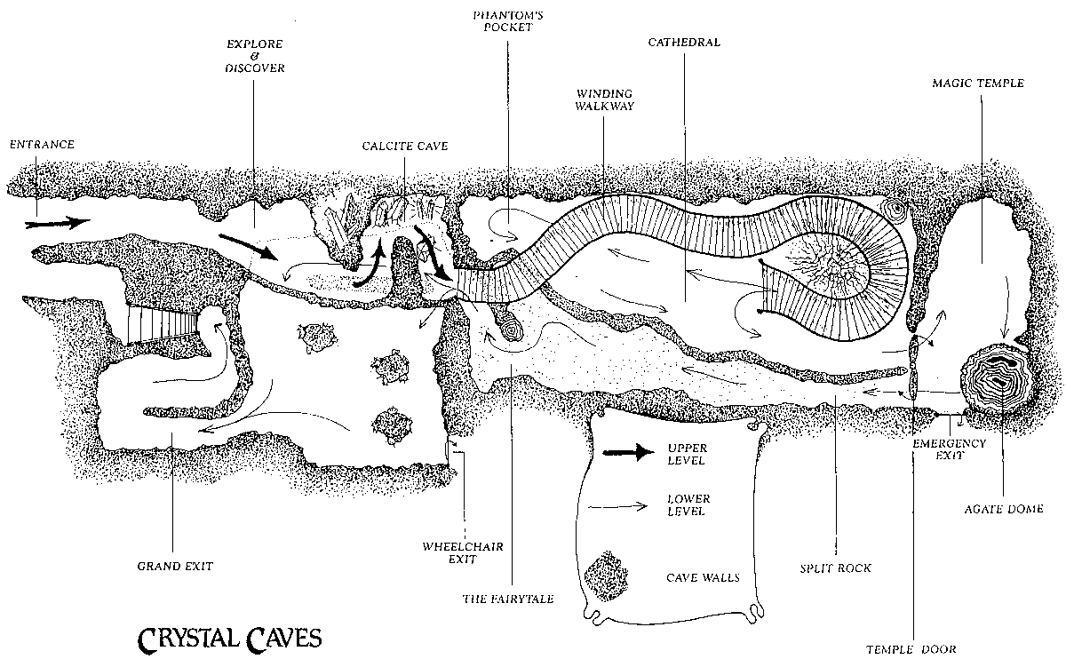 "Caving in comfort. The beautiful and bizarre creations of Mother Earth are brought together and displayed in their natural environment (!)... Prepare yourself for a world where Snowhite and Cinderella have never been... Journey through chambers and passages into the most spectacular grottos and let your eyes feast on a kaleidoscope of colour... Stand in awe and look around... Above you the stalactites shuffle, beneath you the dolomite volcano is about to"