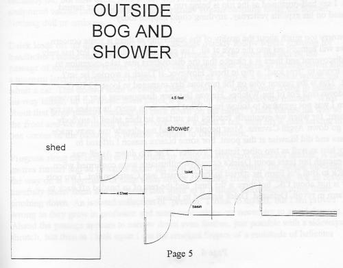 We also need to decide where to put it. The options are rather limited as a blank section of wall about 6 feet long is required, preferably near the shed as the shower will principally be used by people coming back from caving. My favoured position is between the shed and the cottage as shown on the attached plan as it will be easier to connect to the water, sewerage and electricity. It would be level with the back door, ie. sunk down about 18 inches. This will obviously, however, reduce the access to the shed to some extent.