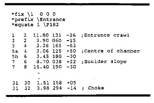 The basic principle of the program is to accept standard survey readings (distance, bearing and inclination) and from this produce plots, coordinates and close loops. The 3D feature produces a network of lines representing the survey legs on a PC monitor which can be rotated and moved as required. This is very useful for helping to visualise complex systems and seeing just how close different sections of passage are located to each other. From the raw survey data the system will also produce the position of each survey station in Cartesian form (ie. in an x, y and z frame). This is useful when drawing out a survey as it can be used to accurately place stations on the drawing. The loop processing is also interesting. The basic idea is that if you survey around a loop, the chances are that when all the station coordinates are calculated, the ends won't meet. What SURVEX will do is tell you how big the errors are and then jiggle all the points around the loop in a sensible manner until the ends do meet. This also allows the surveyor to spot any gross errors. An example of the type of data you feed in is shown below: