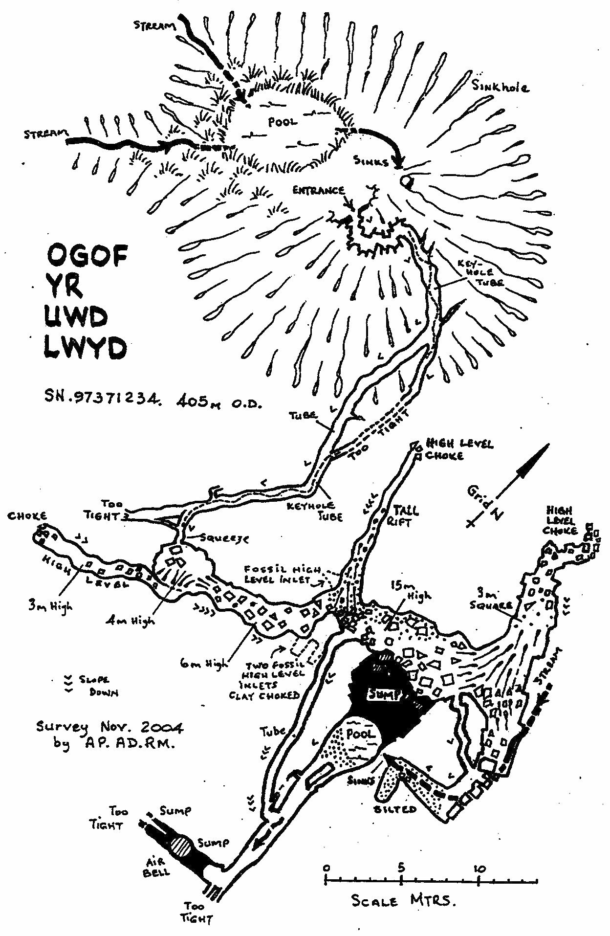 Brown Porridge had sprung from being a mildly interesting site to one of more potential and we decided to start reworking it. The only problem was that since my last visit in 1995 the entrance had collapsed in a fairly major way. Nothing about the entrance choke looked familiar. A large block had detached itself from the ceiling, the stream had backed up against it and deposited many years worth of debris, obscuring the original entrance crawl. However, with the offending block removed and much scaffolding inserted, the small phreatic tube beyond was finally gained. After a bit more work in the entrance crawls the main passage was finally gained in November 2004.
