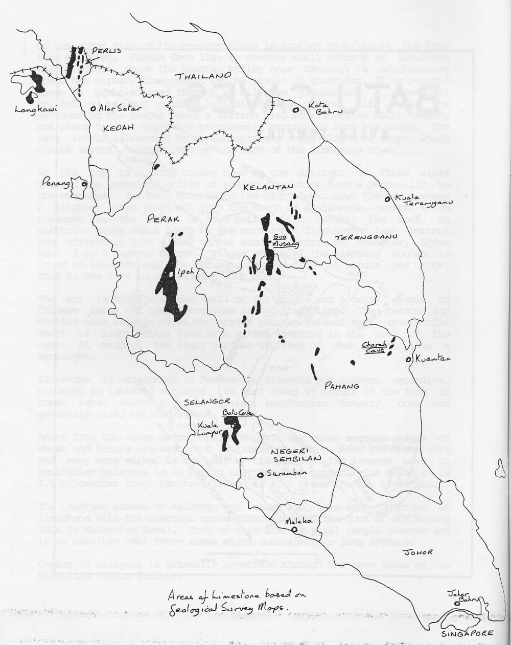 Limestone is widespread in Peninsular Malaysia but nowhere extensive, occuring in isolated outcrops. In most cases it occurs in the form of tower karst which although giving spectacular scenery, does not generally yield extensive cave.