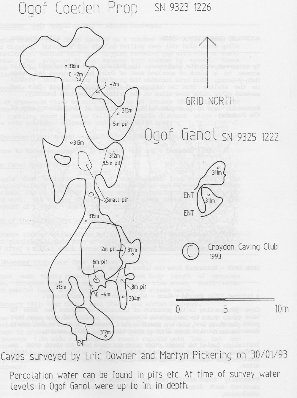 As part of a wider exercise to survey all of the caves around the Ystradfellte area, Eric and I have produced a survey of Ogof Coeden Prop and Ogof Ganol (see next page). We are now in the process of surveying Ogof Ffynnon. Eventually, we intend to publish a complete survey of all of the caves, including their positions in relation to each other and the surface.