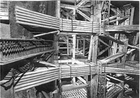Impressive chamber followed impressive chamber and included a 9m deep lake, but the piece de resistance is the Michalowice Chamber. It was worked for almost a hundred years in a vertical block of green salt. The cribwork is centred on two vast pillars of multiple round tree trunks bound together trough, which the stairs climb.