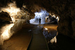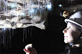 I joined the “Spellbound” cave tour; mainly because at £35, its 3 hr duration with 2 caves and a cup of tea seemed the best value available. It was in fact very good. After a drive through the “awesome” karst landscape around Waitomo we walked down to the first cave; a spacious dry system with electric lighting, some nice formations and the fossil bones of a Moa (giant ostrich-like bird now extinct). The second cave was an active river sink in the same system which was explored with a lamp and helmet. The ceiling was festooned with glowworms and as we were taken on a magical boat trip down stream to a sump. As our eyes became more accustomed to the dark the vast numbers in the streamway roof became apparent. With our headlamps turned out, there was sufficient light generated by these creatures to make out the cave walls and reflections in the water. Remarkably it was possible for the party to exit the cave relying solely on the light of the glowworms. Perhaps one of the most refreshing aspects of this trip was that not only was photography positively encouraged but they also supplied a free set of souvenir shots direct to your email. Thus a couple of shots are included below courtesy of Spellbound at http://www.glowworm.co.nz