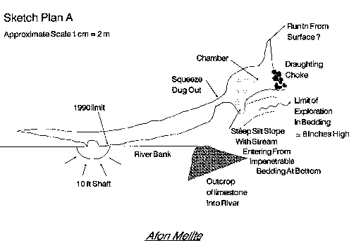 This sight has been extended somewhat since a 10ft shaft was sunk - see diagram A - to reach a mud-choked phreatic tube with a draughting airspace in 1990. In the summer of 1991 this phreatic tube was dug for approximately 30ft by myself to break into a small chamber approximately 15ft long by 5ft wide by 4ft high. A steep silt ramp led down on the right hand side of this chamber. At the base of this ramp a small percentage of the total water sinking at Church Sink that day was seen issuing from an impenetrable bedding. Downstream, a tight bedding approximately eight inches high was pushed by Malcolm Stewart for approximately 15ft with the sound of cascading water ahead. A draughting choke was also noted at the back of the chamber.