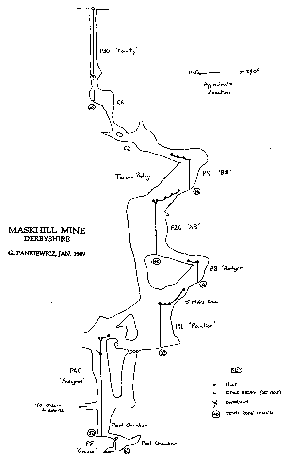 The result is the survey which accompanies these notes in which each pitch or free climb is shown together with recommended belay bolt positions (a la Elliot and Lawson). Perhaps surprisingly the survey resembles the one in Caves of Derbyshire (CoD). The main reason for producing it is to indicate to those descending using SRT a reliable, tested route with knowledge about total pitch and rope lengths required. (As always, the author cannot accept liability for the readers confusion or for their 'lost pints').