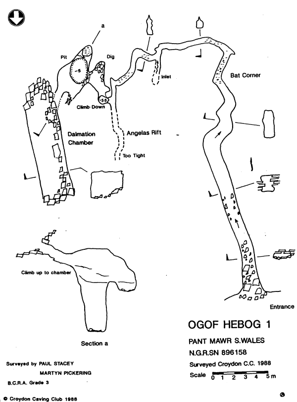 A 5½in climb which is awkward on the way down, and even more so on the return journey leads into a chamber of larger dimensions with a roof height of several metres. A dig in the floor of the chamber has left a 5m blind drop with a small inlet flowing away at the bottom. A precarious manoeuvre across to the other side of the chamber leads to a rose protected climb up a slippery slope and into a boulder choke in the roof. Another boulder choke may be entered in a rift running north from the chamber, this is highly unstable but draughts well.