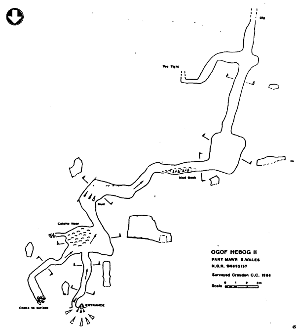Whilst waiting for the bat to leave site Number I the entrance to Number II was dug by Jon Young, Chris Fry, Adrian Paniwnyk and Paul Stacey on 18th March 1988. They explored and surveyed about 40in of cave which ended in a tight, mud filled tube a little way beyond a mud/sand floored chamber. This was dug on 7th May and then again on the 8th by Chris Fry, Paul Stacey, Sarah Tindall (SWCC) and Adrian Paniwnyk. At this stage the diggers were sure that they were almost through. On 14th May ten minutes digging gave access to an open continuation of the tube, about 7m long with another passage going off to the left. On 21st May Chris Fry, Chris Crowley and Martin Hatton dug in both of these passages. Work on the left hand one was stopped when it became obvious that there was a very clear aural connection with the surface. Digging in the main passage continuation is becoming difficult due to the narrowness of the tube and limited spoil tipping space.