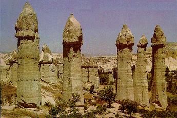 The strangest area is Cappadocia in the centre of Turkey. Several million years ago when the world was young, 3 volcanoes; Erciyes, Hasan and Melendiz Daglari, erupted in this region covering a huge area of land with a layer of tuff (compressed volcanic ash) overlain with lava. This layer was at least 100 metres deep and covered an area some 20 miles square. As the lava cooled, cracks appeared allowing the wind and rain (of which I am assured there is plenty, although we saw precious little) to erode the tuff into a surreal landscape.