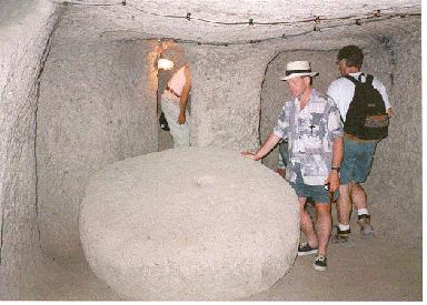 South of the triangle, where there are no more chimneys, the people who lived in Cappadocia were still able to exploit the properties of tuff by digging huge underground towns where they could barricade themselves against invading armies. These towns are thought to date back to about 1900 BC. In times of peace these towns were used for storing food and wine, but when war threatened, up to 30,000 people could survive underground in one town for a month. The entrance tunnels could be blocked by massive stone wheels, which were rolled into place from within. Pouring boiling oil through little holes in the middle of the stone discouraged attacks upon these 'gates'. It can only be a matter of time before this idea is taken up by people who have those little spy holes in their front doors and feel threatened by double glazing salesmen.